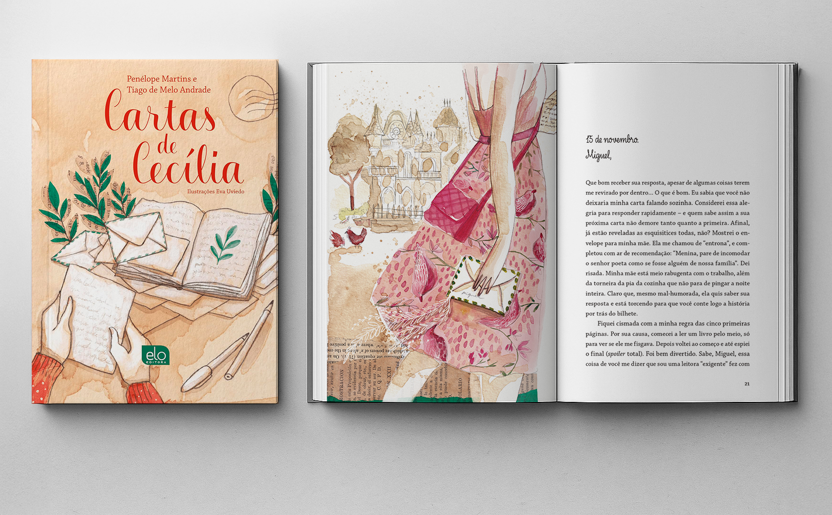 Ilustrações para o livro Cartas de Cecília [Elo editora, 2025], de Penélope Martins e Tiago de Melo Andrade. O projeto é um romance epistolar, ou seja, se desenvolve através de uma troca de cartas. A narrativa das ilustrações, pensadas uma ou mais para cada capítulo, tem a carta como centro, mas se expande mostrando o cenário de quem a recebe. No capítulo em que a carta é enviada por Cecília, o cenário mostra a mão de Miguel recebendo - e vice-versa: quando é ele quem escreve, vemos Cecília lendo ou segurando a carta. A técnica combina aquarela com colagens de páginas de livros antigos, evocando o universo da leitura e das trocas afetivas.