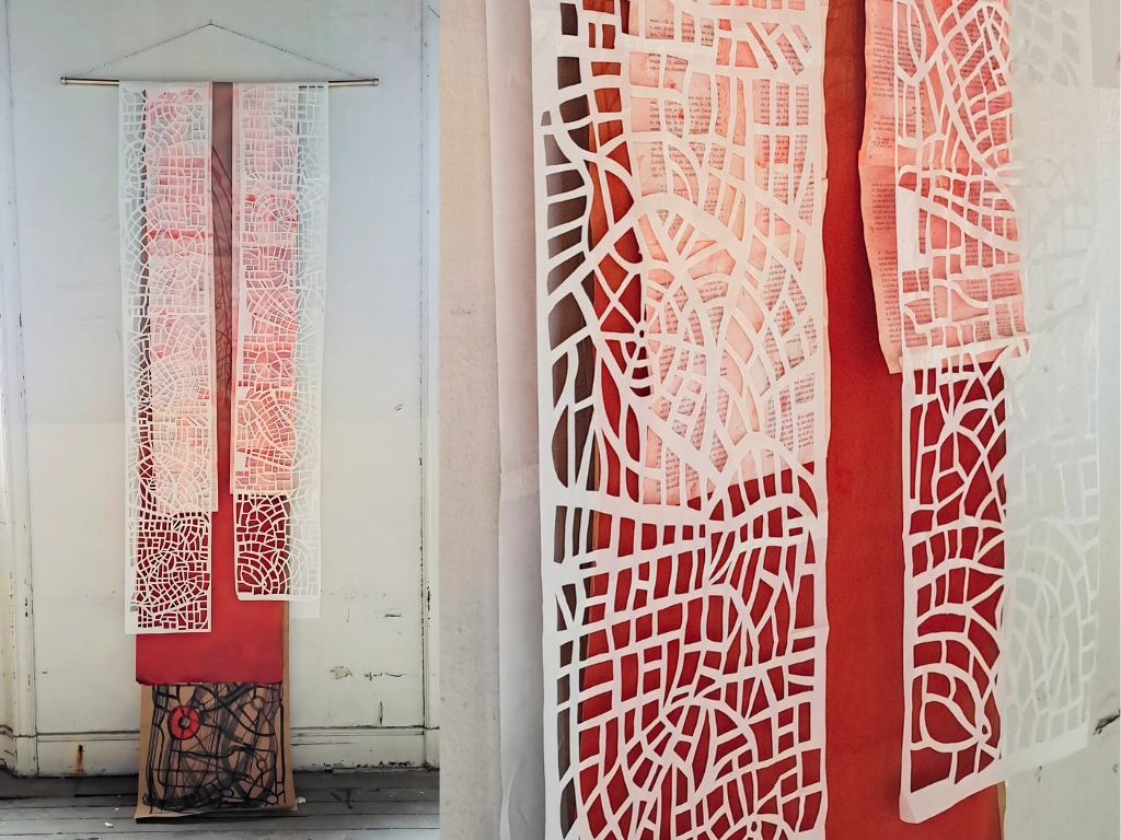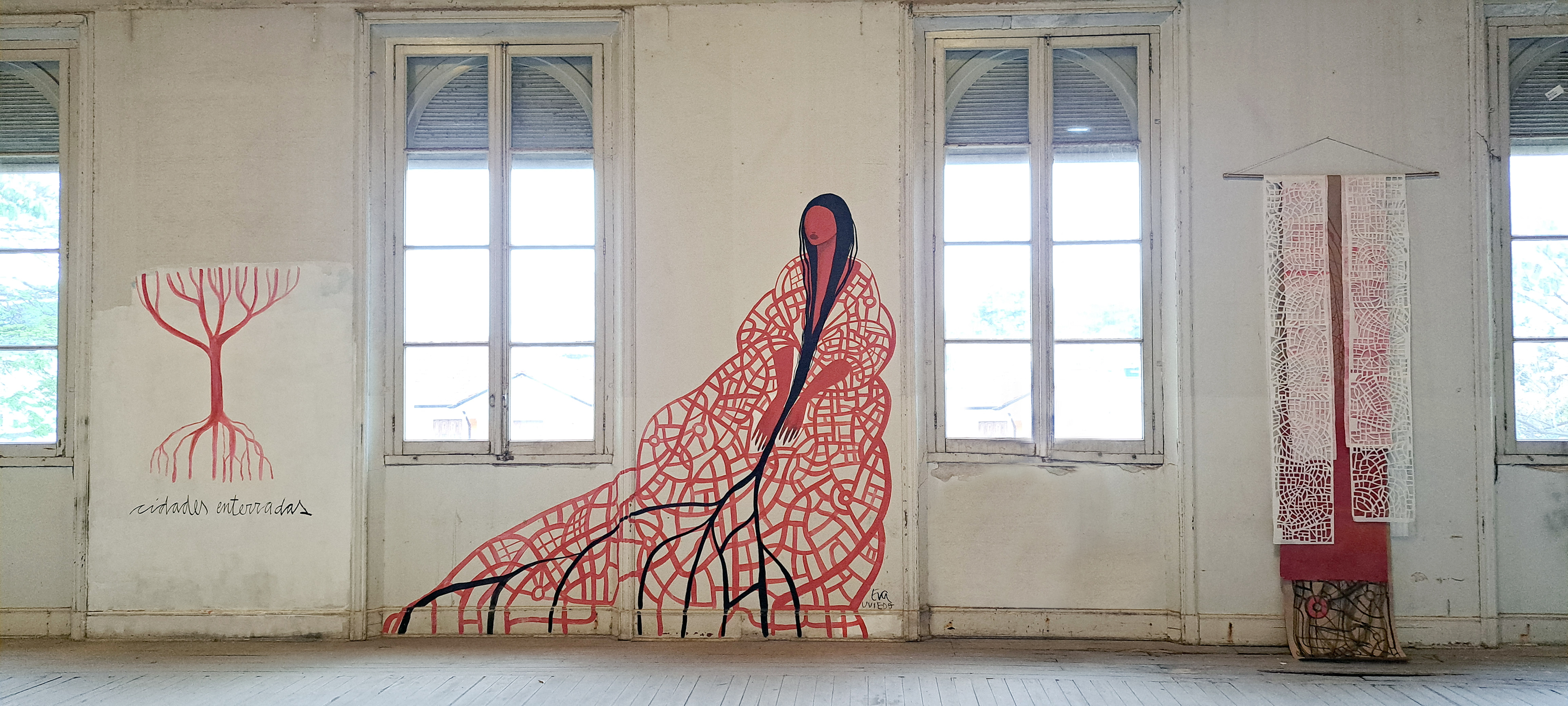 The work, a site specific composed of two acrylic paintings on the wall and a third piece of overlapping painted craft paper, pages from a Catholic book and cut tracing paper. It dialogues with the Guatemalan legend about ancient civilizations buried and forgotten, whose cities rest beneath modern metropolises and forests. Located on the wall of a convent from 1917, the mural represents intertwining roots, evoking the memory of these civilizations. The female figure, covered by a mantle of intricate paths, seems to emerge from these historical layers, connecting past and present. The contrast between the worn-out environment of the convent and the imminent transformation into a commercial building reinforces the tension between memory and progress. The interventions in tissue paper, delicately cut into the shapes of maps, emphasize the fragility of hidden memories that resist accelerated urbanization. The work, by incorporating history and space, reflects on what remains buried not only in the soil, but also in the collective consciousness.