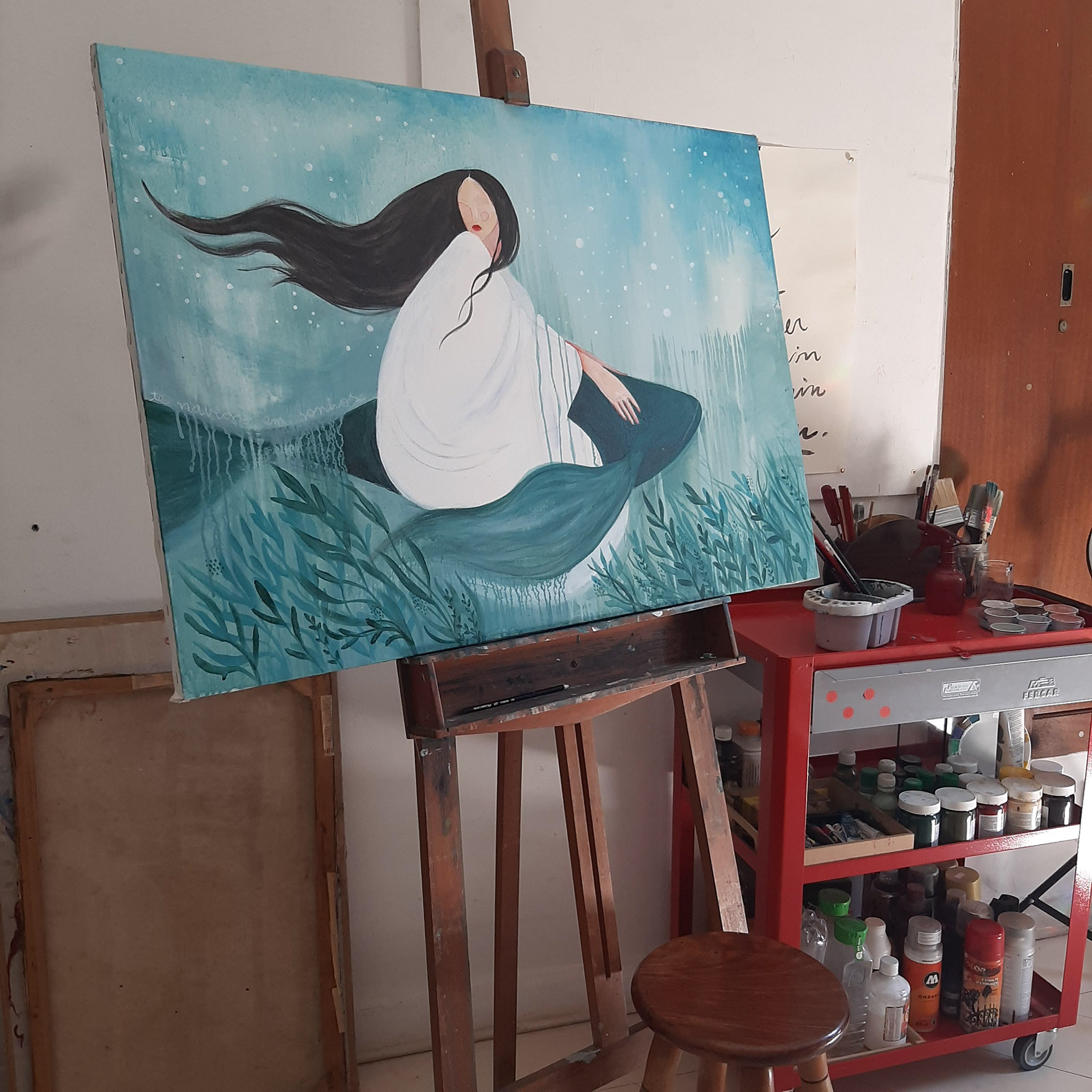 Peças únicas disponíveis para venda, como telas em diversos tamanhos, aquarelas e pratos pintados à mão.
