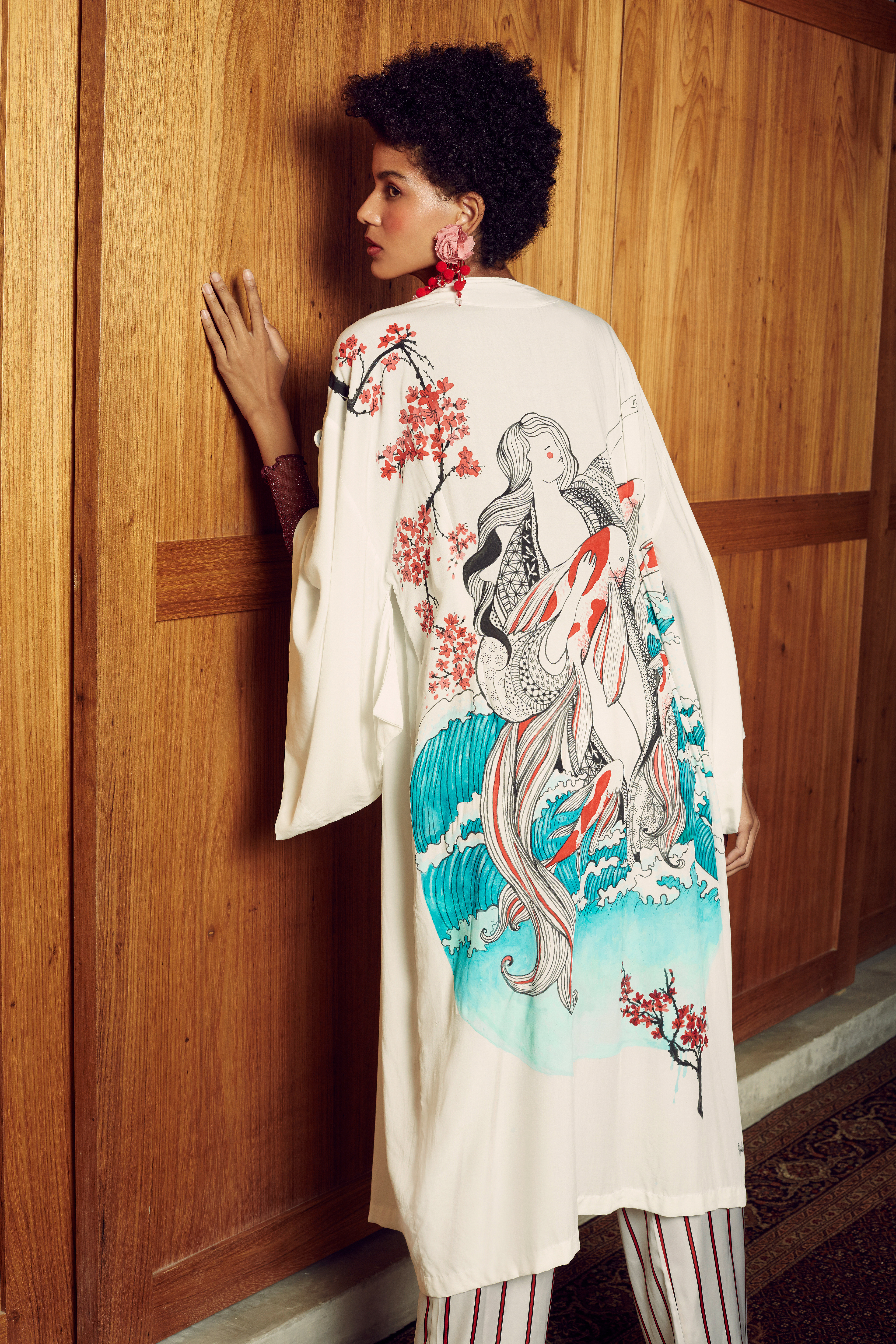 Projeto artístico de pintura personalizada de quimonos para a marca paulistana Kimoh. A primeira peça foi leiloada e teve venda revertida para Instituto Mundo Aflora, que auxilia na autonomia e resgate de auto-estima de meninas em situação de risco. A partir de então, iniciou-se uma parceria com a marca para produzir peças personalizadas sob encomenda a partir da história de vida das clientes. Uma longa entrevista sobre história, gostos, interesses e momento de vida é o ponto de partida para identificar a questão a ser abordada e serve de inspiração para o desenho, pintado à mão na peça. Acompanha uma carta, em tom pessoal, fazendo votos e explicando cada um dos símbolos, mitos e lendas que guiaram a criação da obra.