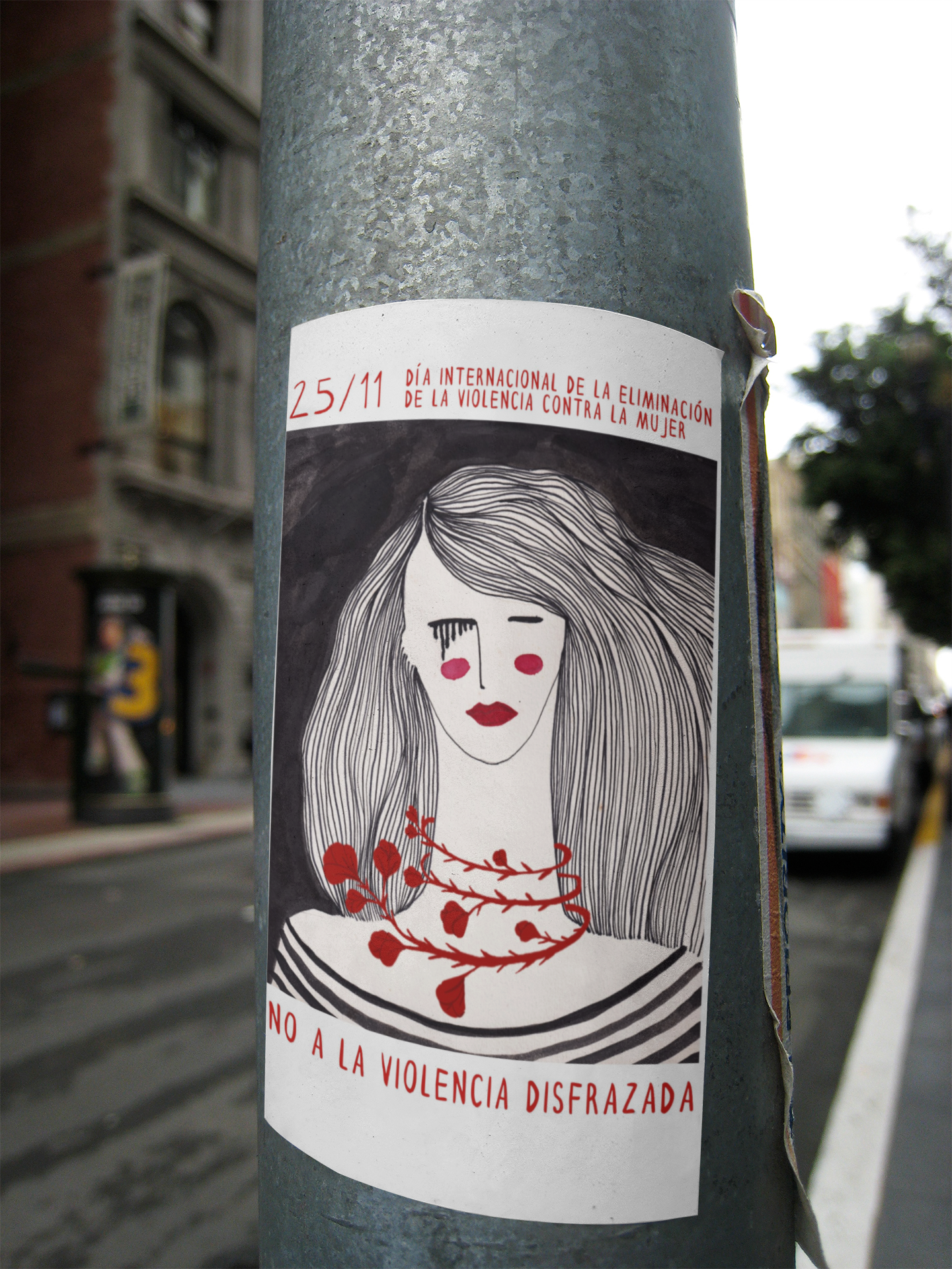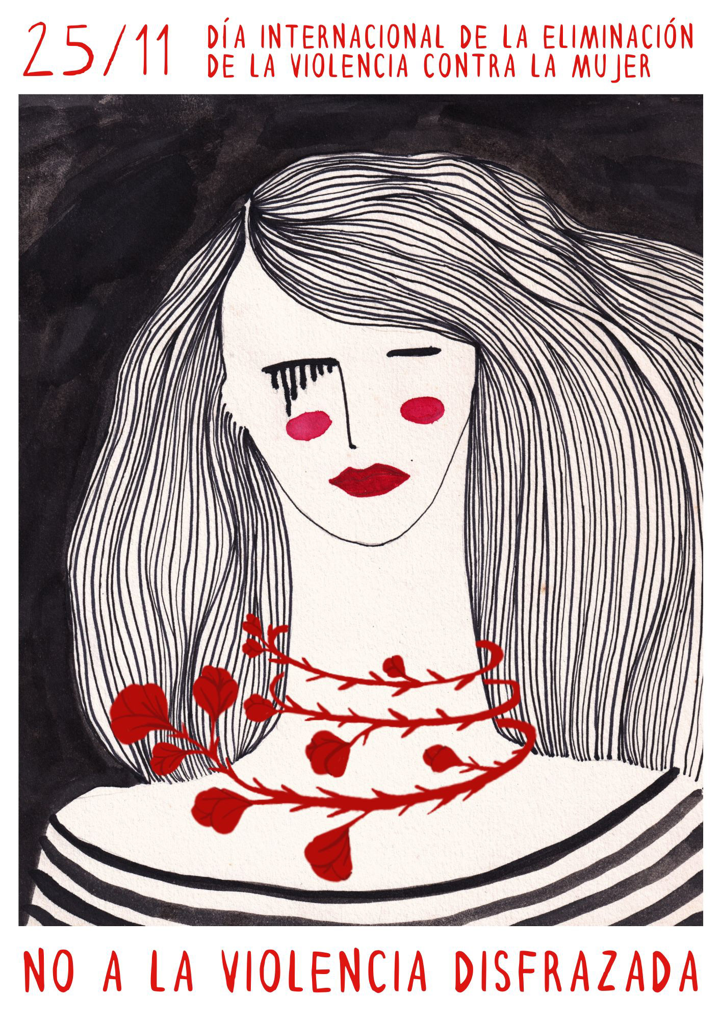 Poster and sticker for the campaign to eradicate violence against women. The arts talk about the violence that happens disguised as supposedly romantic acts. Jealousy and possessiveness are not acts of love but of control.