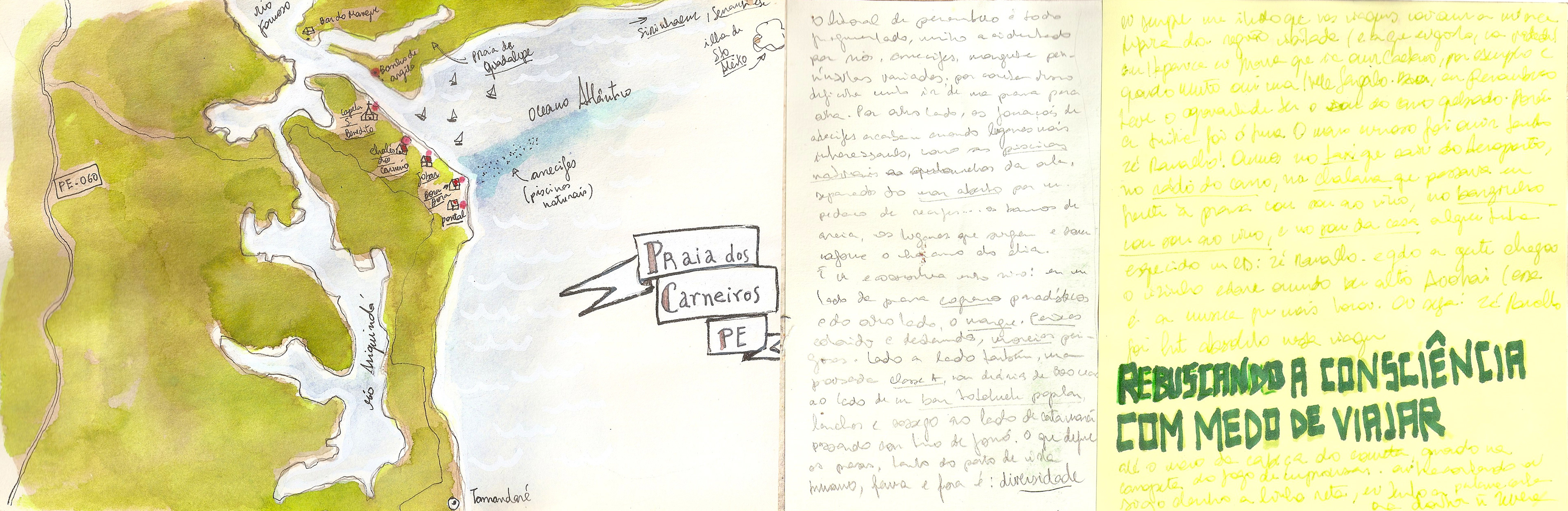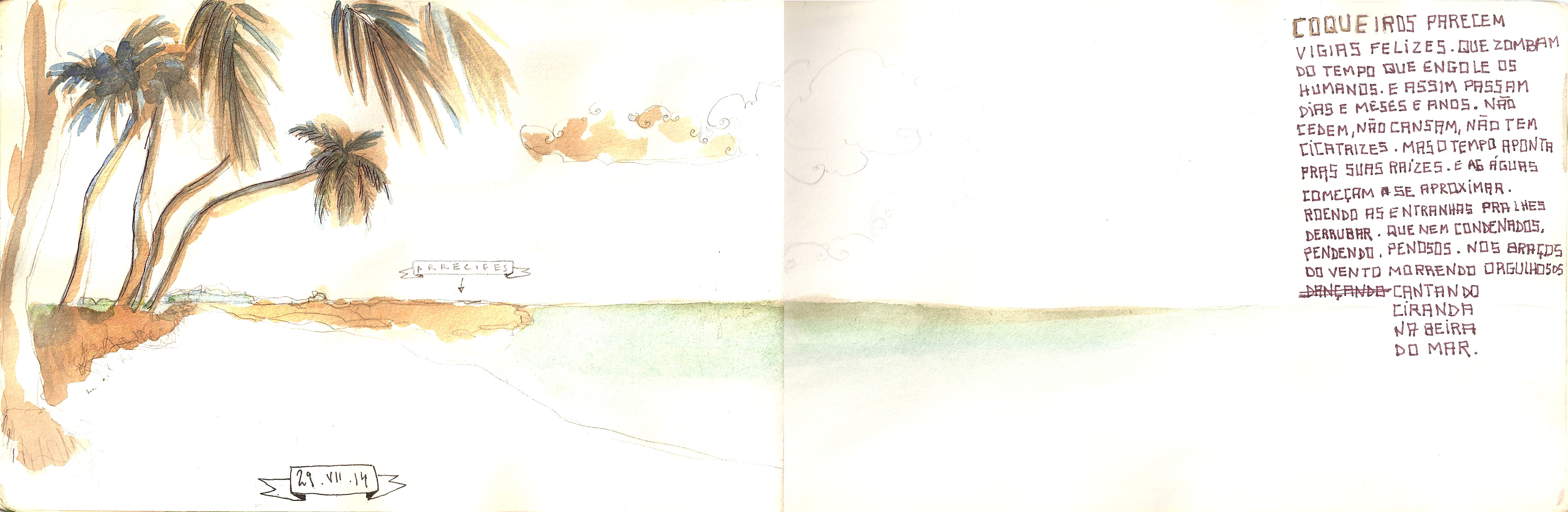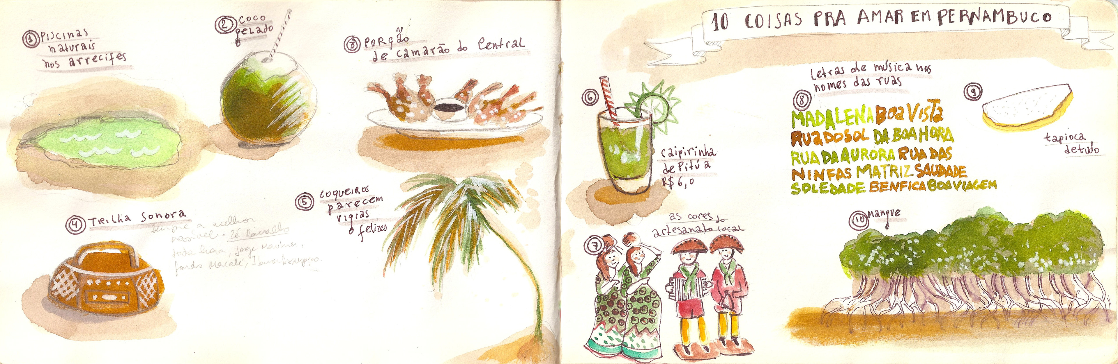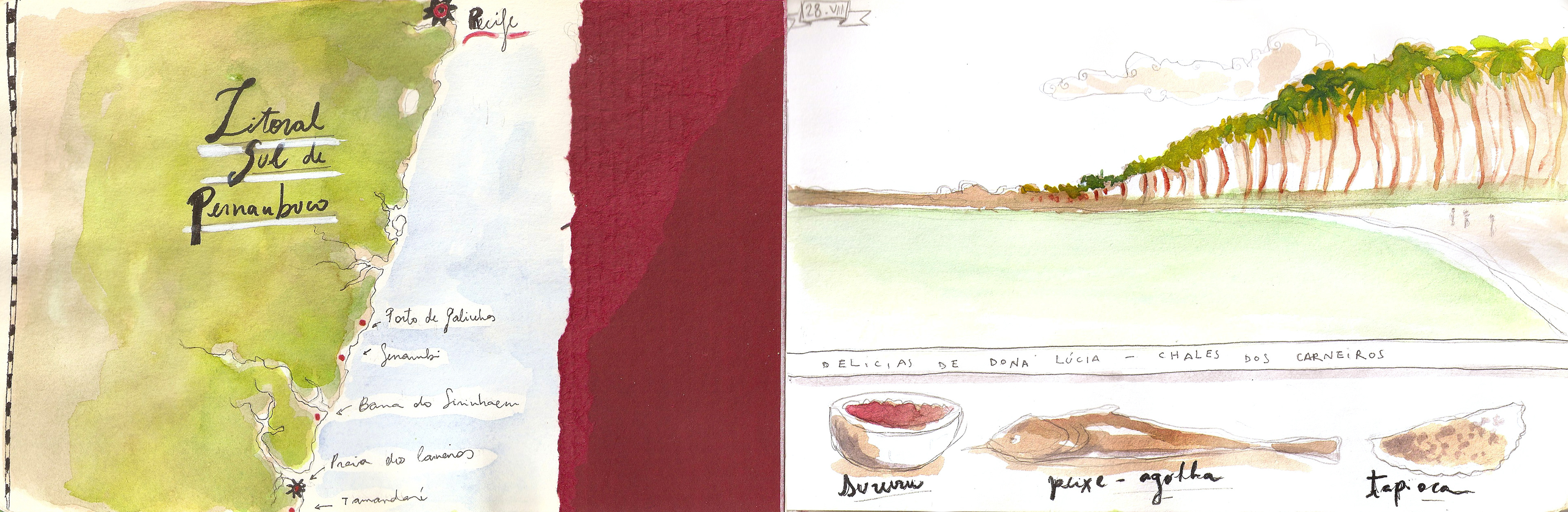 Caderninho de viagem que fiz em 2014 para Recife e Praia dos Carneiros, em Pernambuco, passando uma tarde em Maragogi, Alagoas.