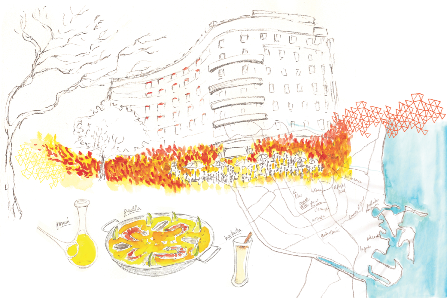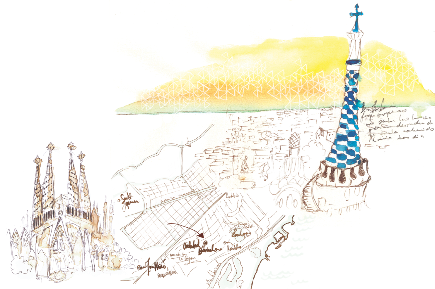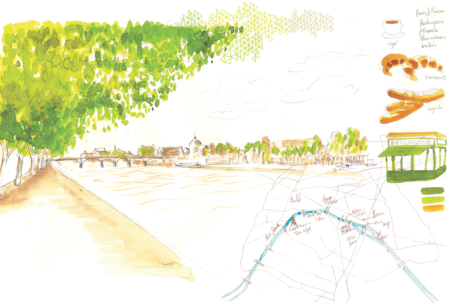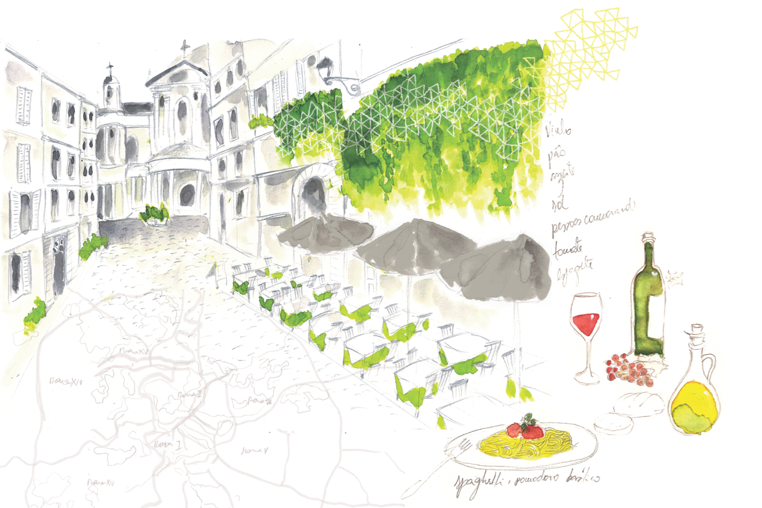 Ilustrações para o livro "Queria Ter Ficado Mais", uma coleção de contos escritos por mulheres sobre viagens a vários lugares do mundo, também dialoga com o universo das viagens. Cada um dos capítulos foi impresso em folhas soltas, dobradas e acomodadas dentro de envelopes, como se fossem cartas enviadas dos lugares que as autoras visitaram. Aquarelas inspiradas nos textos apresentam as regiões retratadas, como se fossem extraídas de um caderno de viagem.