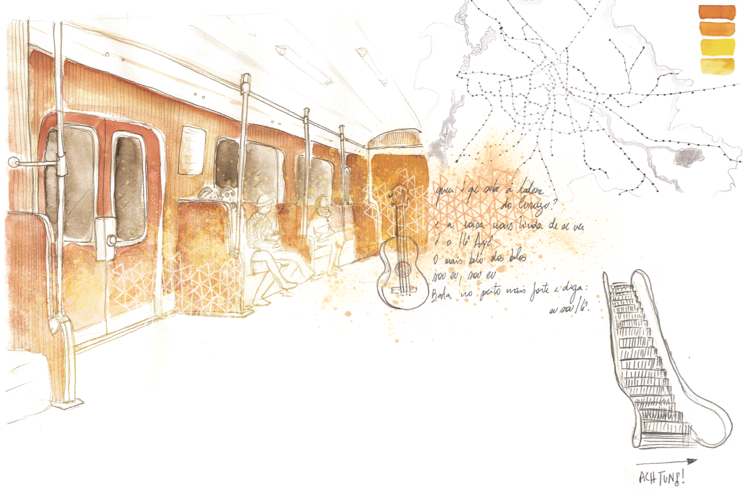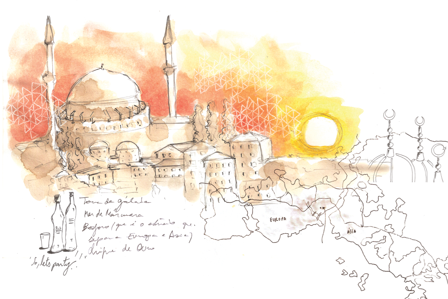 Illustrations for the book "Queria Ter Ficado Mais," a collection of short stories written by women about their travels to various places around the world, also engage with the world of travel. Each chapter was printed on loose sheets, folded, and placed inside envelopes, as if they were letters sent from the places the authors visited. Watercolors inspired by the texts present the regions depicted, as if taken from a travel notebook.